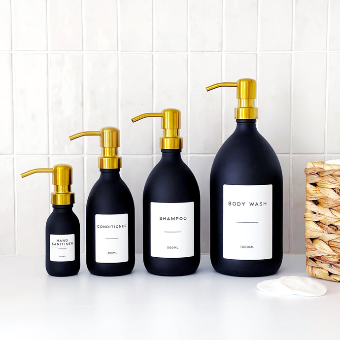 Matt Black Glass Dispenser Bottle With Personalised Label & Gold Metal Pump