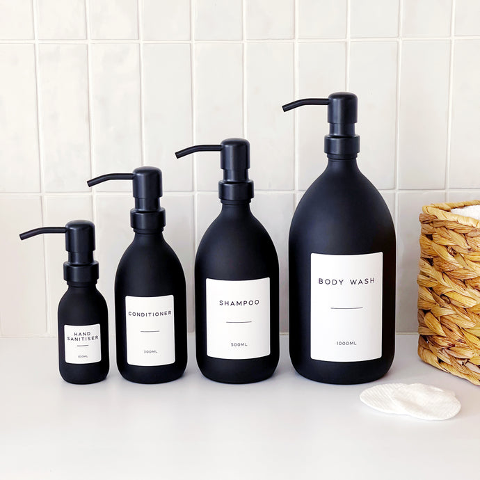 Matt Black Glass Dispenser Bottle With Personalised Label & Black Metal Pump