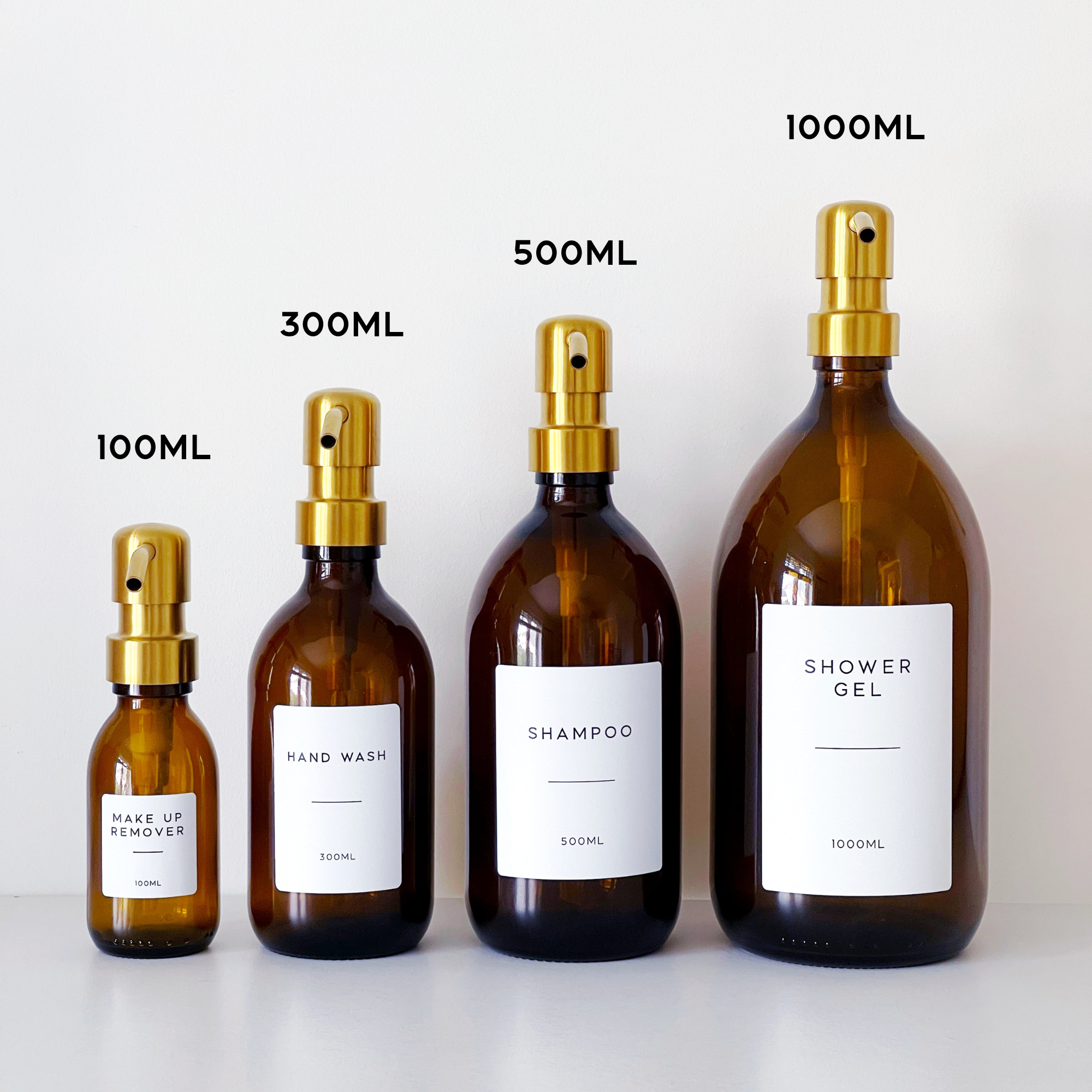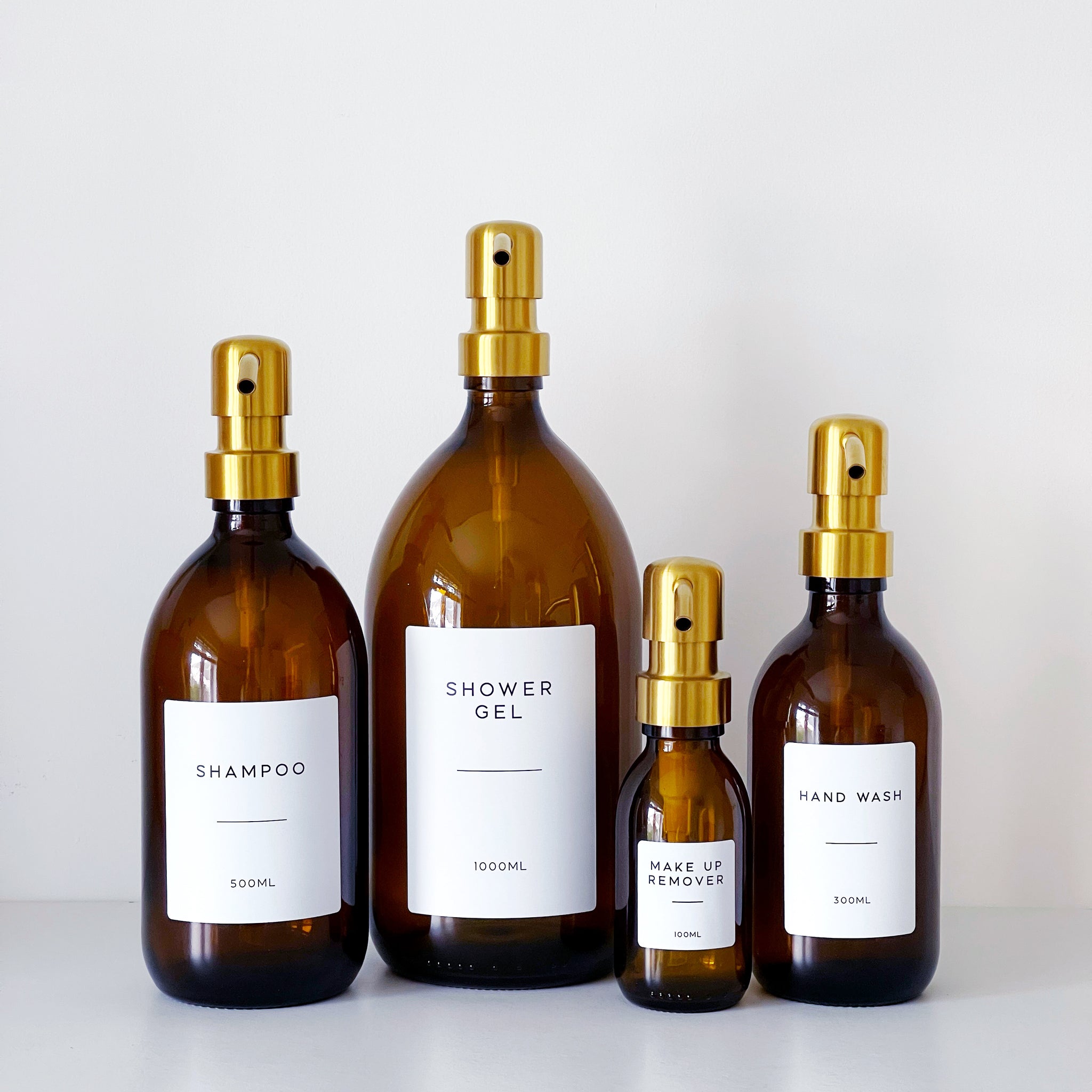 Finished with a matt white minimalist personalised label and gold stainless steel metal pump dispenser.