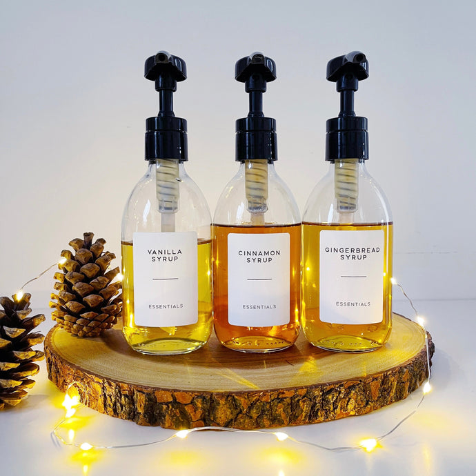Clear Glass Syrup Dispenser Bottle With White Personalised Label And Plastic Pump
