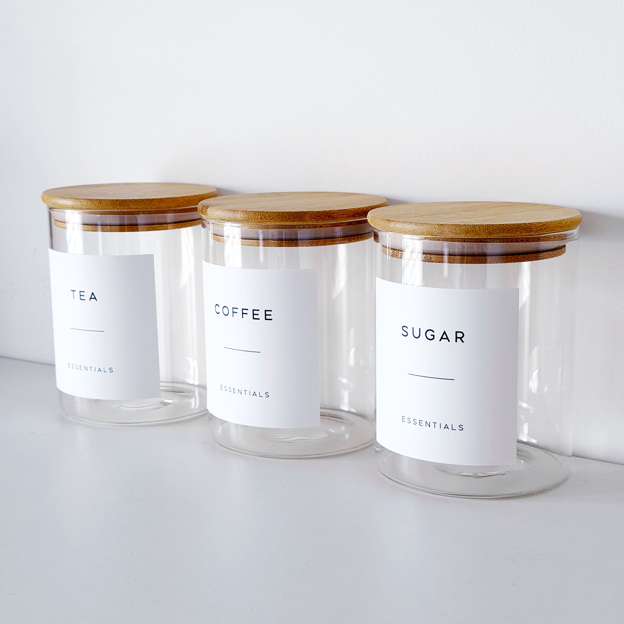 Set of 3 x 800ml round glass storage jars with bamboo wood lids & waterproof labels.