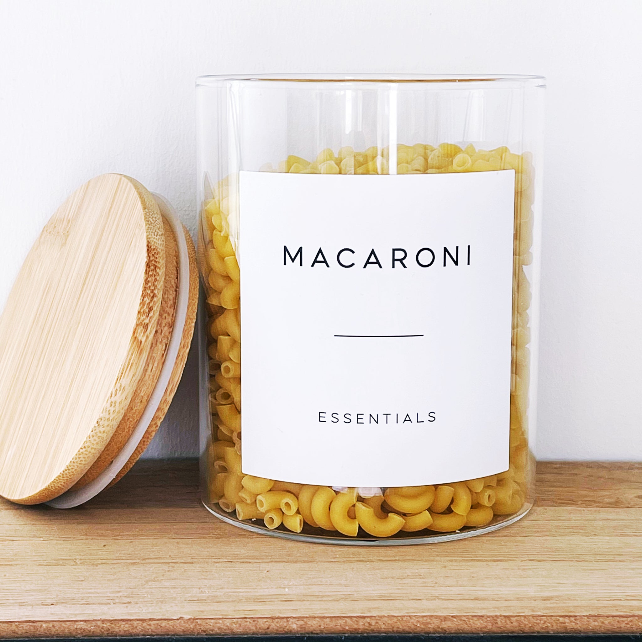 Clear glass storage jar with airtight bamboo wood lid and white personalised minimalist label.